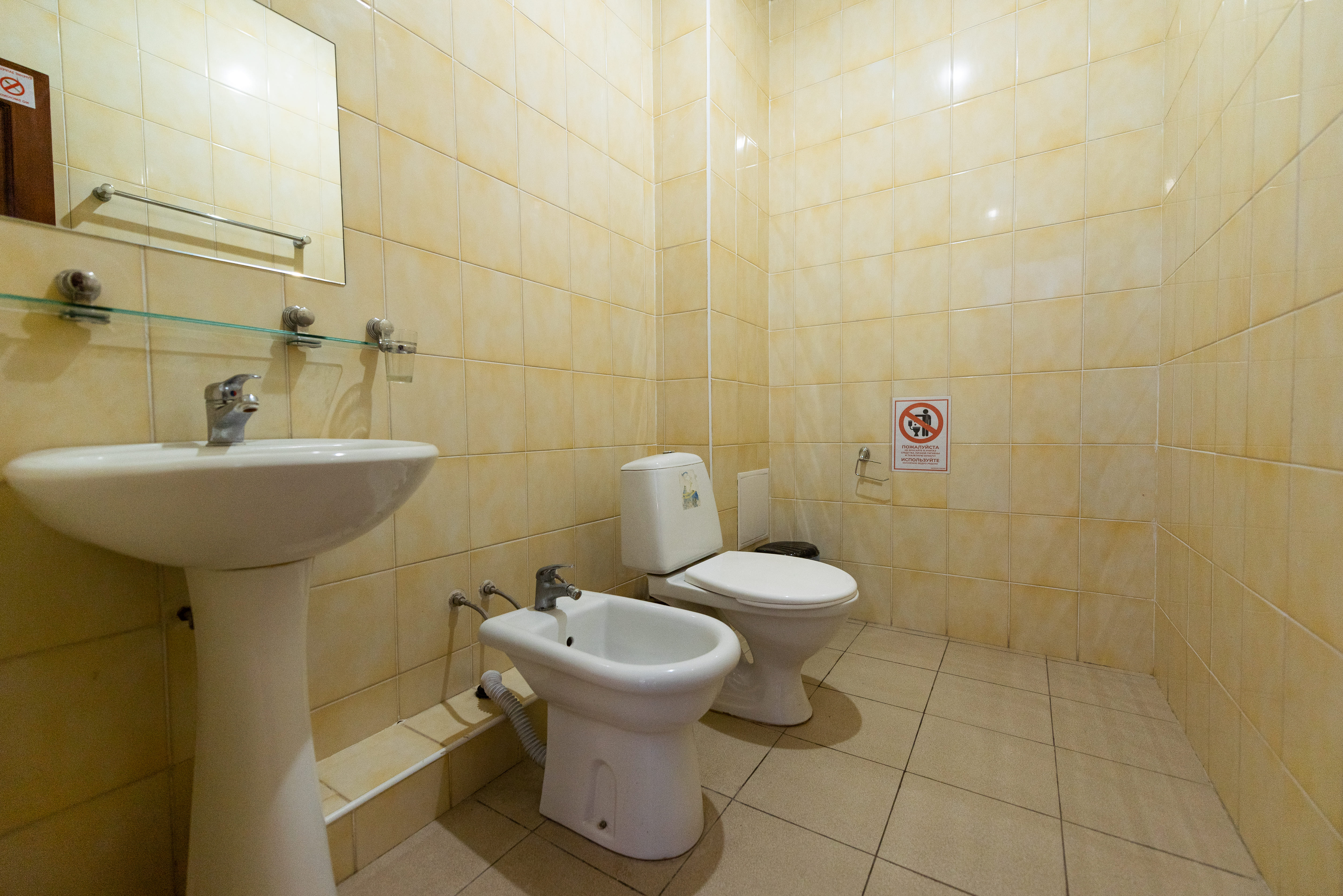 Санузел отделан плиткой и оборудован раковиной с зеркалом и полкой, унитазом и биде.