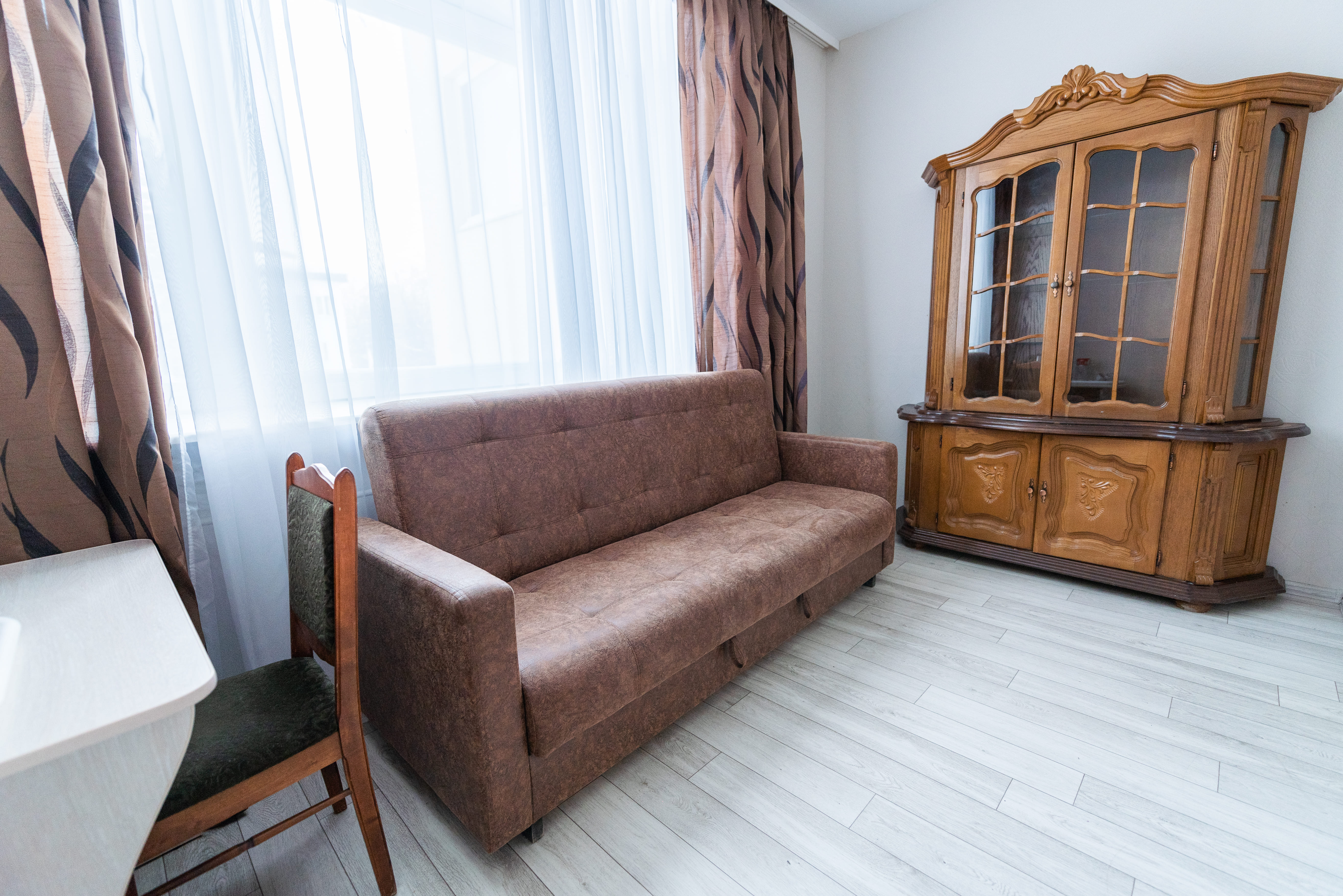 Во второй комнате расположены диван и шкаф-витрина для хранения. В комнате есть окно с шторами, а также стол и стул.