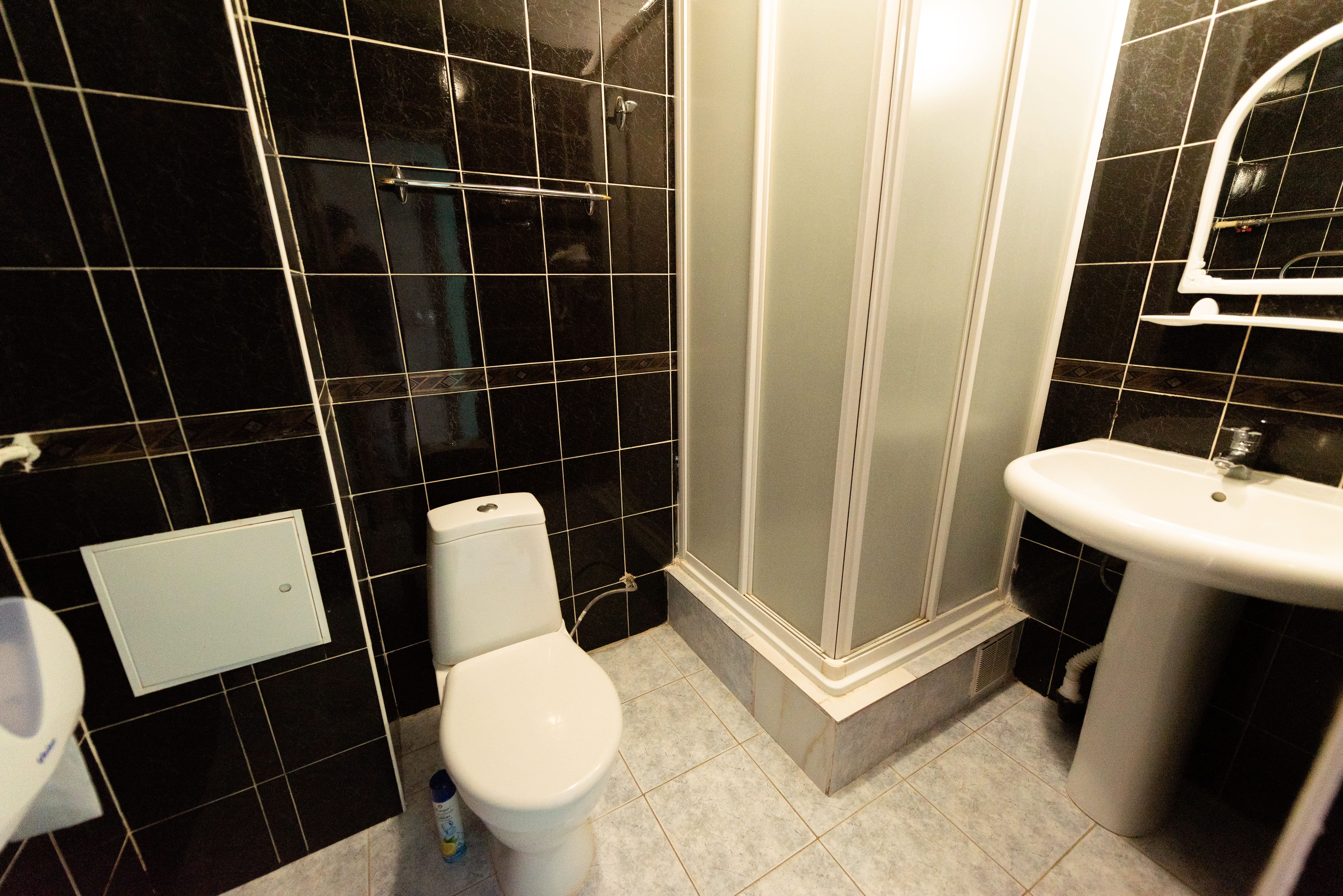 Санузел оснащён душевой кабиной, раковиной с зеркалом и унитазом.
